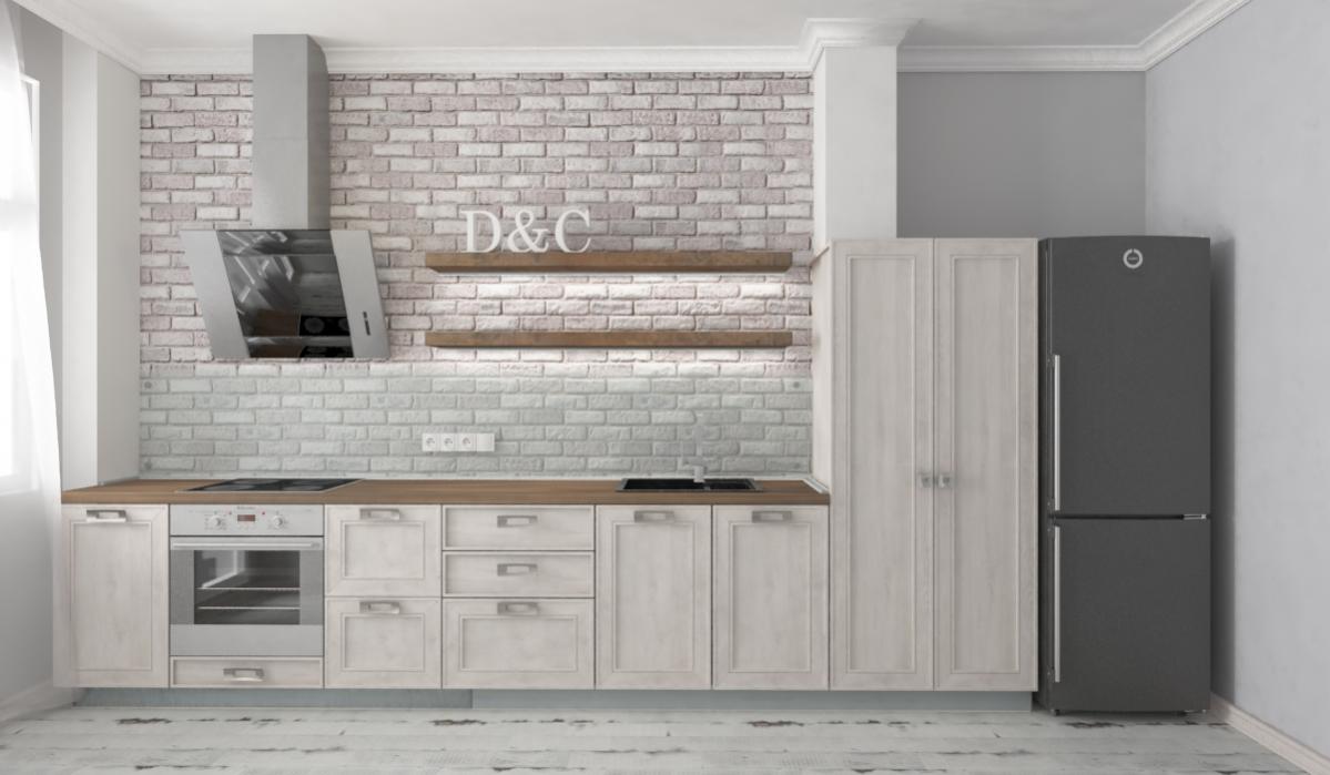 холодильник у нас большой, шириной 90см, над ним тоже будет элемент шкафчика, но его видно особо не будет