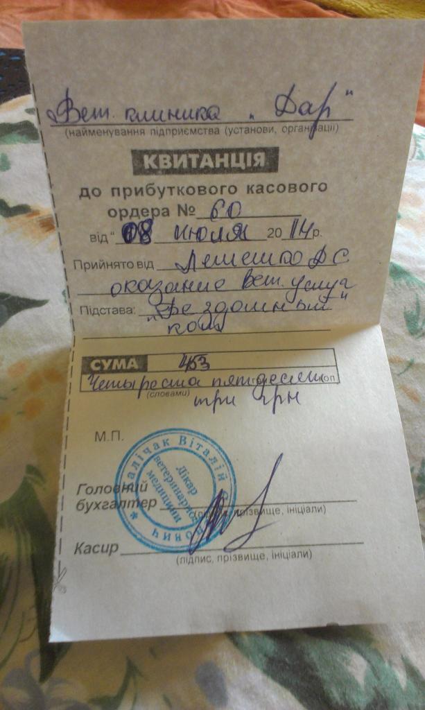 Обслуживаемся мы в вет.клинике"Габи" на ул.Глушко.Из-за травмы челюсти животное не может ни есть, ни пить,его организм поддерживается капельницами и уколами.Посещение клиники в день обходится нам от 90 до 200 грн.