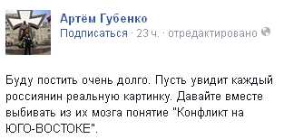 Масово з'явилися повідомлення про те, що Росія упродовж 48 годин уведе "миротворців" в Україну. Я переконаний, що таким чином Путін навмисне намагається залякати Порошенка, щоб той дав команду зупинити АТО. Путін нам пропонує вибір між капітуляцією і розчленуванням України. Тому у нас вихід один - тільки звільнити Донбас від терористів. Якщо Президент зараз не піддасться на тиск з різних сторін і діятиме на Донбасі рішуче - за тиждень ми матимемо жадану перемогу. Тоді і за стіл переговорів сядемо з Росією. Бо далі звільнятимемо Крим. Слава Україні! Смерть окупантам!