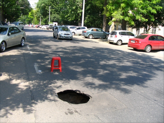 Провал, образовавшийся на дороге возле дома №11 по ул. Малая Арнаутская, угрожает движению автотранспорта.