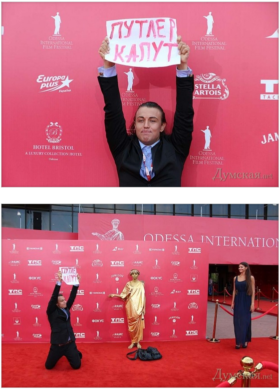 Для этого он выскочил на красную дорожку с плакатом «Путлер капут». Стоит признать, что охрана фестиваля не была готова к такому инциденту и не предприняла никаких действий, чтобы прекратить акцию. Крикнув пару раз слова известной песенки «Путин -х..ло», Довлатов ушел с дорожки самостоятельно. (с)