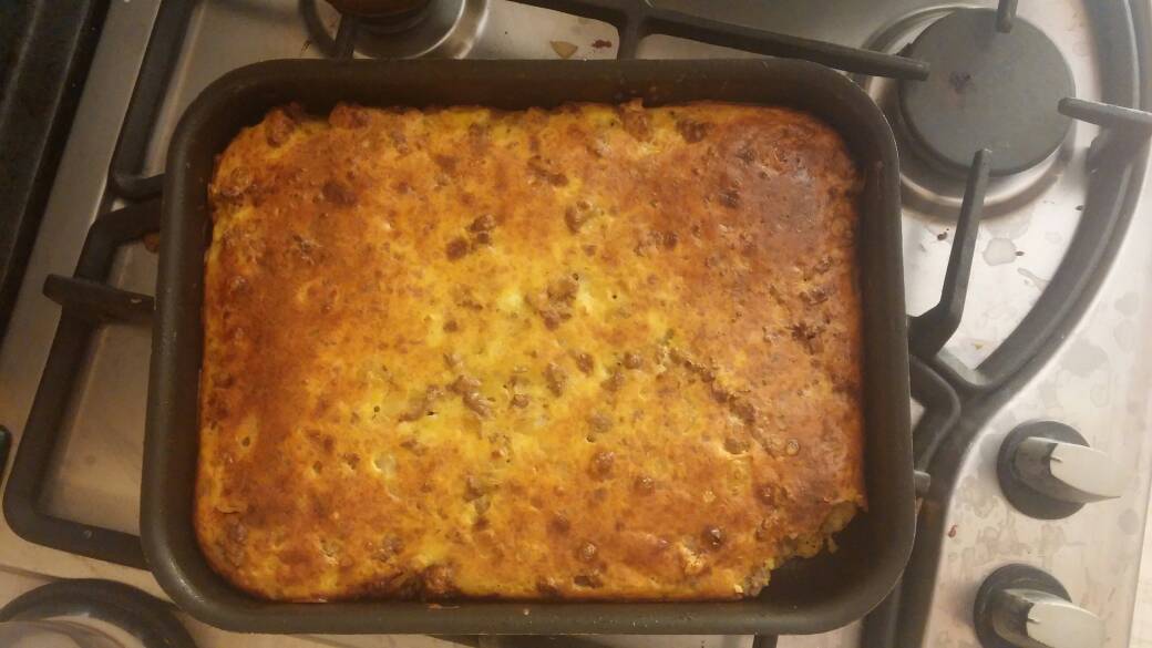 Вылить половину этой массы в форму, выложить начинку и вылить остатки теста. Поставить в заранее разогретую до 180 градусов духовку. Выпекать до готовности… примерно 25-30 минут. Можно есть как в горячем так и в холодном виде.