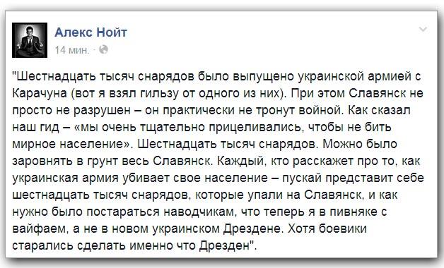 «Мухи, шмели, минометы, 43 ящика мин к минометам, большое количество боеприпасов…все чем родное минобороны не хотело нас снабжать ( нет согласований) получено на гостеприимный складах местных сепаратистов. Особенно хорошо пошла липецкая тушенка под тульское сгущенное молоко. Почти все раздали местным жителям и нам чуть чуть осталось. Вкусно. Жалко хлеб надо доставлять из Артемовска. Может подкинете хлебушка из Ростова на Дону?», рассказал он.