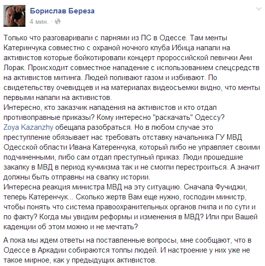 Одессит Игорь Марков заявил, что без военного положения в Украине невозможно применение армии. Но Родина глубоко больна, возможно, раком. И Марков призвал к немедленному прекращению огня. Славно лишь, что настроения начали меняться, поскольку стали приходить гробы. Марков отметил, что если в Киеве не возьмутся за голову, возможен и парад победителей на Крещатике.
