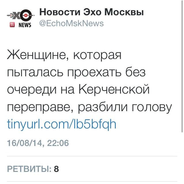 На Керченской переправе была избита женщина, которая пыталась проехать без очереди. Как сообщает kerch.com.ru, после конфликта с другими путешественниками женщина на машине скорой помощи была доставлена в травмпункт с раной головы, передает Газета.ru.