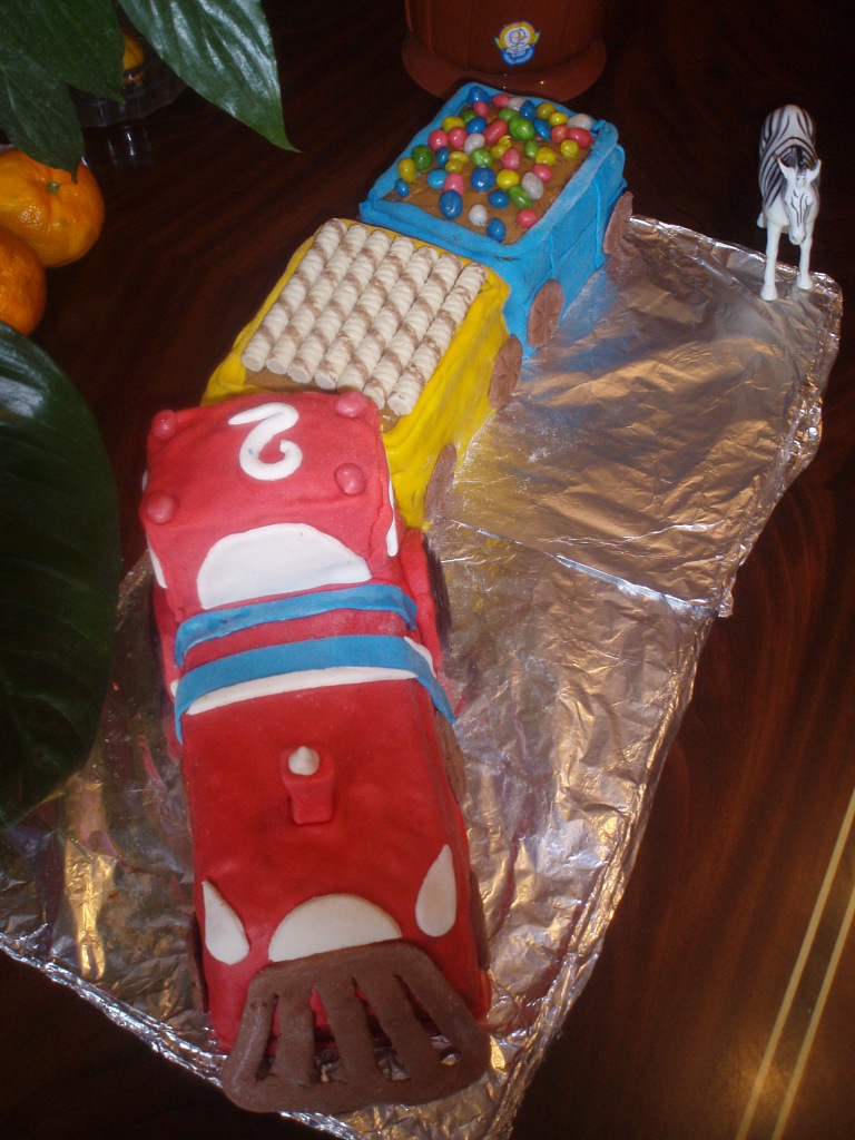 Вот . Делала знакомому малышу на ДР , не сложно совсем , у меня форма прямоугольная , испекла бисквит , разрезала на пополам , положила друг на дружку вот тебе и вагончики .