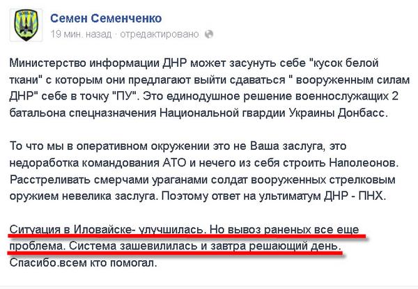 - Порошенко, судя по всему, прервал визит в Минск. Завтра переговоров не будет. Сразу после переговоров с Путиным наш президент покинул Минск и возвращается в Украину. Ну и отлично. Так и лучше. Братья, все будет хорошо. Мы на своей земле.