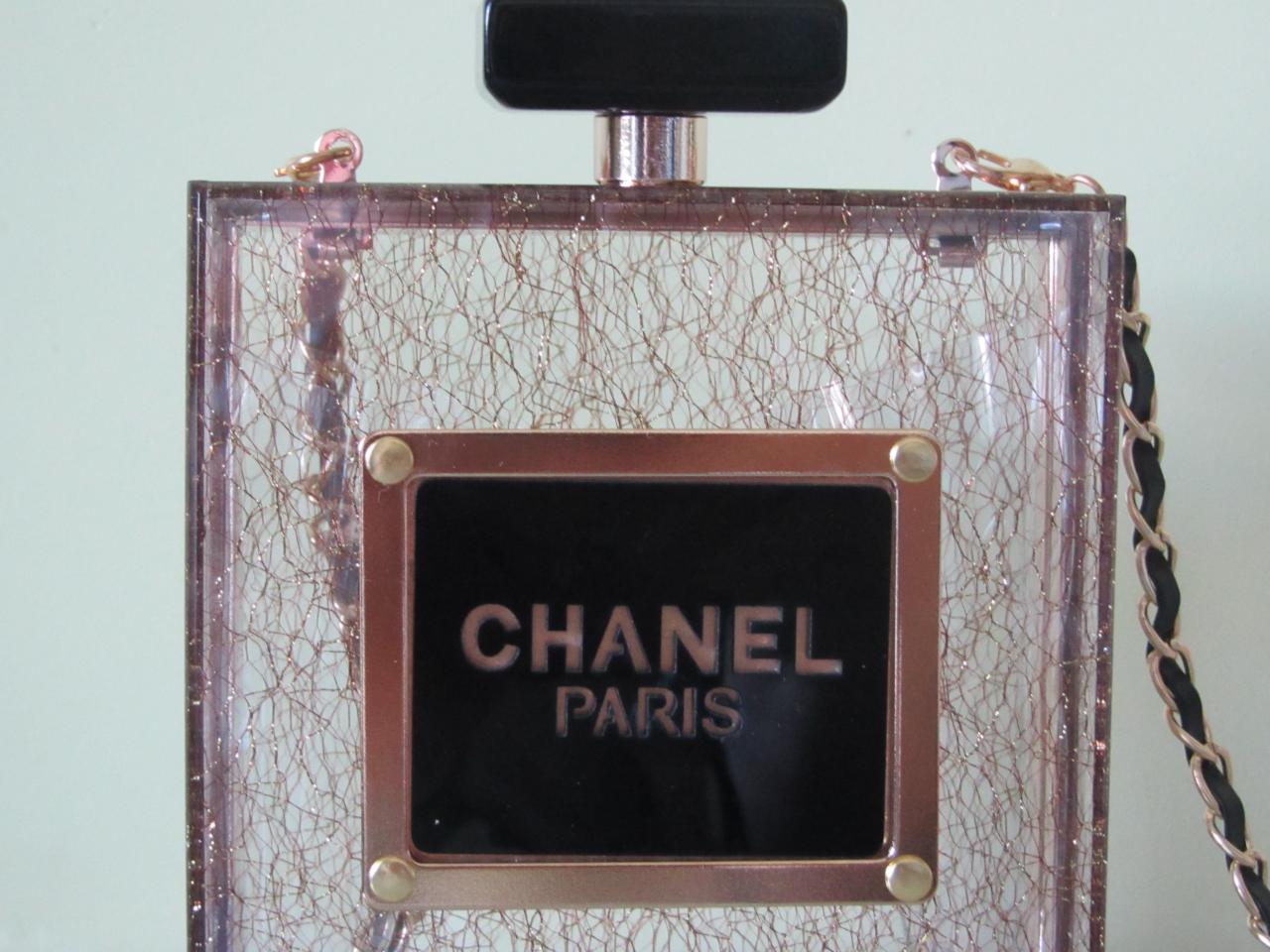 Гламурная прозрачная сумочка CHANEL стилизованная под флакон духов. Сумочка носится на изящной цепочке, защёлка выполнена в виде крышечки флакона.