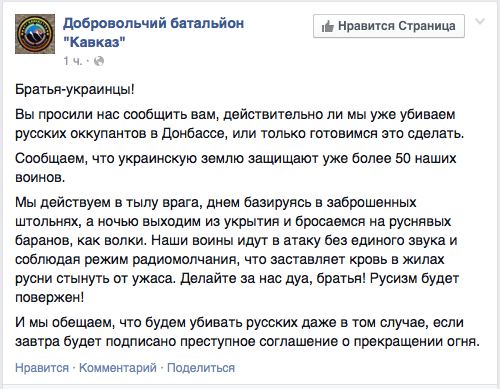 Братья-украинцы! Сегодня мы здесь, здесь для того, чтобы помочь вам победить в неравной и нелегкой борьбе с кровавой Империей, уже не одну сотню лет угнетающей окружающие ее свободные и миролюбивые народы! Мы пришли с гор, среди нас есть люди из Дагестана, Чечни, Ингушетии, кабардинцы, черкесы - мы все пришли за головами русских оккупантов. Наши отцы дали русне по зубам на Кавказе, и наше же призвание - загнать русское быдло туда, откуда оно появилось - в дикую Московию, изгнать дикую Орду с захваченных ею земель. Смерть кровавого русского монстра неизбежна. Это факт. Это даже не обсуждается. И мы сделаем все, чтобы низвергнуть это животное в пучину ада как можно скорее.