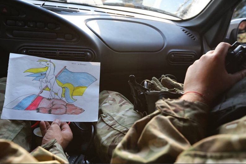 Девочка подарила свой рисунок солдатам-защитникам Мариуполя. Подпись: "Катя из Донецка".