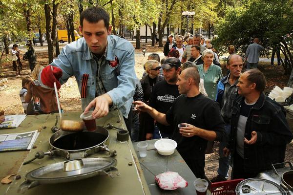 и что такого на этом фото из Луганска,кроме парочки "людей в черном"??голодные пенсионеры,мама с ребенком,мужчины и женщины,оставшиеся на данный момент без работы и средств к существованию и вынужденные есть с рук любого подающего...лица,не отягощенные интеллектом ?так если на то пошло, и у нас таких хватает, подавляющему большинству запечатленных просто изначально не повезло с местом рождения...а местный социум доделал свое дело...