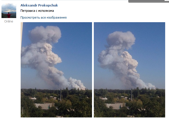Где-то со стороны вокзала Донецк только что упала, наверное, атомная бомба. Гриб не вырос, но это было что-то страшное, сначала купол огня, потом ударная волна, от которой у меня окна сотрясались, а по расстоянию это далеко от нас. Теперь возвышается огромный столб дыма. Это не простое оружие было. Если вконтакте у кого-то есть, то ссылка: