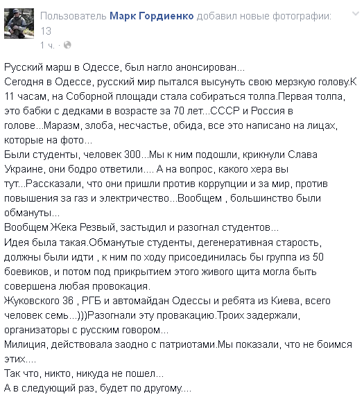 Вот эти одесские еху с совком в голове. Позорище.. Когда одесситы 30 марта вышли на Марш Мира с украинской символикой, эти с колорадскими (рашистскими) ленточками кричали: "Путин, спаси, нас убивают фашисты за русский язык!"