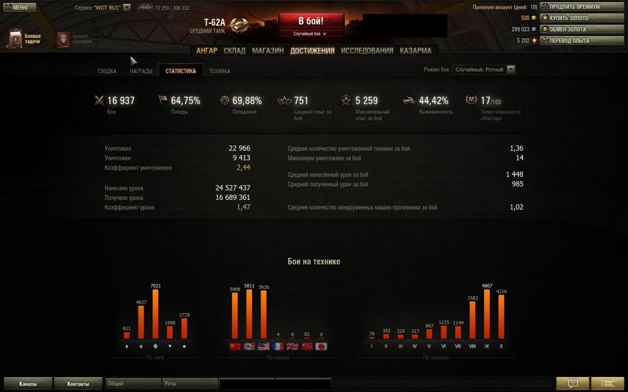 В ангаре: ИС-7, Т110Е5, T-34(Прем), T-62A, E-50M, PzKpfw VIB Tiger II, Jagdtiger, M48A1 Patton, T30.