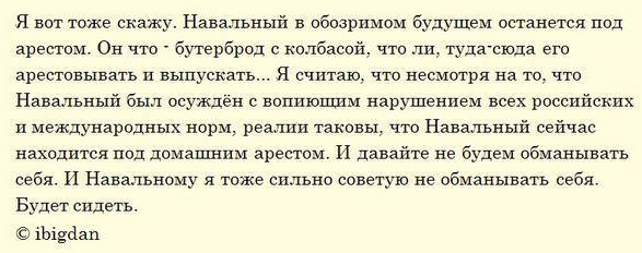 «Призыв Алексея Навального скорее всего останется криком вопиющего в пустыне его патриотических сторонников из партии «Крымнаш», которые и без всяких призывов верят в то, что Крым теперь навечно останется путинским. В этом милом заблуждении я и оставляю наивного или слишком прагматичного молодого политика. Напоследок предлагаю ему пари, что до 15 октября 2015 года Крым благополучно возвратится в Украину»,– написал политик. http://ru.krymr.com/content/article/26640623.html