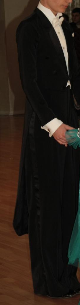 Продам фрак с рубашкой, пластиковым воротом. В хорошем состоянии. Рост 170-175 см, плечи- 35 см, между лопатками 33-34 см, дина рукава - 57 см, обхват руки в бицепсе - 27-29 см, длина фрака от ворота до низа фалд - 122 см. Брюки: внутренний шов штанины - 78 см (5-6 см есть ещё в запасе), пояс - в объеме 72-73 см.