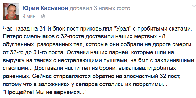 тут как говорится люди гибнут за политику, а не за военные просчеты, как в Иловайске...Бирюков так и написал в комментах, если по военному можно расхерячить всех кто там обложил блок-пост и делу конец, но и перемирию конец, смертность увеличится в разы по всем фронтам, я так поняла...хотя какое это перемирие, уже надо лупить, но я не президент