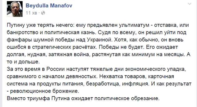 Ви тепер розумієте, чому знищено контрснайперські комплекси, аеророзвідку? Чому розформовано танкову бригаду в Овручі й відведено війська? Вам ясно, чому розміновано всі мости, дороги, лінію розмежування та Чонгар?