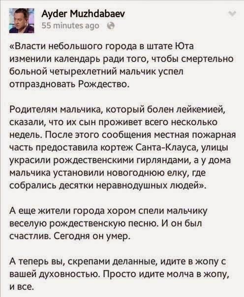 "88-летний сосед моей тети бежал на референдум в мае. Умер через месяц. И наши судьбы вершат сейчас, в основном, вот такие, которым биологически осталось жить крапаль, но обосрать всю жизнь молодым они считают своим святым долгом. Реально нужно принимать закон, запрещающий пенсам волеизъявляться. Т.к. ты уже пожил. Сиди себе спокойно на пенсию и не порть жизнь остальным. Потому что человек после 60 реально меняется. (Не даром чукчи отправляют своих "пенсов" на льдине в кругосветное плавание. Человечество в своей массе начало доживать до 60-70 лет всего какой-то век назад, и у природы еще не сформировался механизм взаимодействия биологически активных особей с пенсами) И далеко не всегда в лучшую сторону. Хорошо еще, если он был умным. А если был неумным, то начинаются сказки "да я жизнь прожил, сопляк, да что ты понимаешь? вот поживи с мое!.." Т.е. они считают что КИ - это как звание в ментовке - с каждым годом капает +10 быллов. И эти мифы про то, как хорошо было в сэсэсэрэ. Да, было хорошо, но тем, кто из себя ничего не представлял и ничего не мог. А те кто представлял и мог, никак не могли реализоваться. И если в сэсэсэрэ первые ничего не делали и могли комфортно существовать, то сейчас они дико обижены, т.к. теперь за ничего не делание ничего и не платят. А в саюзе платиле!"