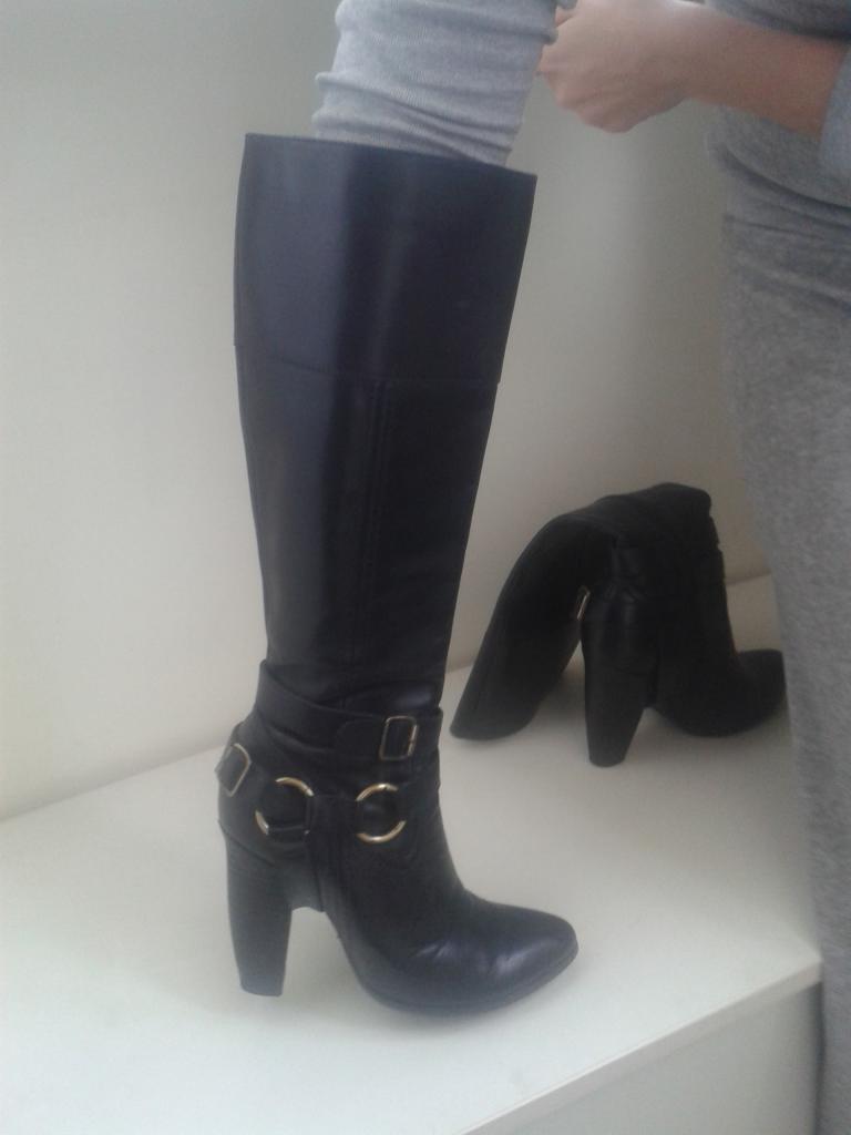 Лот № 1. Сапоги (Италия) черные, полированная кожа, внутри полностью кожаные (деми), кожаный каблук 10 см. На узкие "икры" и ножку, б/у. На ножках смотрятся классно! 400 грн.Торг!