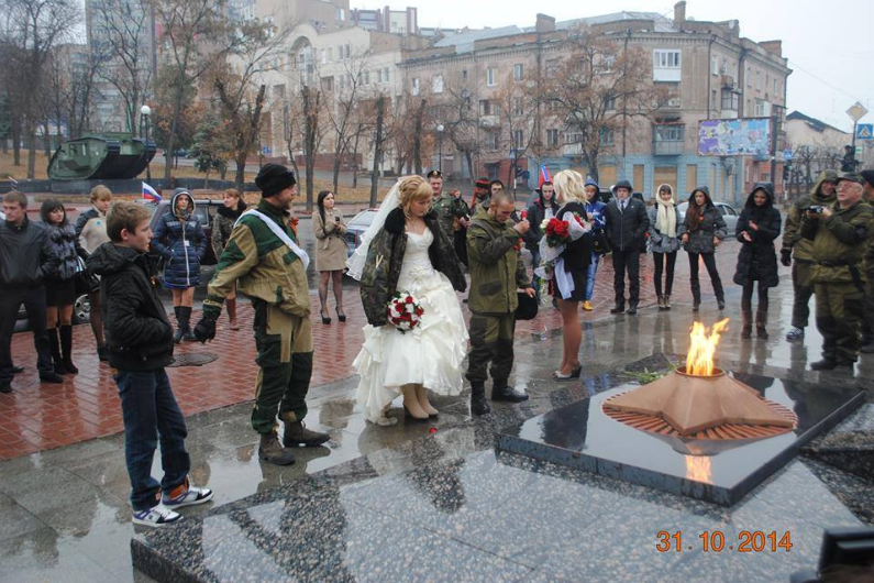 Лугандонская свадьба. Жених крестится перед памятником борцам революции 1917 года, которые массово вешали и расстреливали православных попов. Вечный огонь, озаряющий праздничное действо, сжигает дефицитный украинский газ, который оплачивается из карманов вражеских украинских налогоплательщиков.