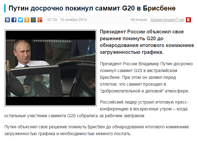 На пресс-конференции Владимир Путин объяснил свое решение покинуть Брисбен до обнародования итогового коммюнике загруженностью графика и необходимостью немного поспать.