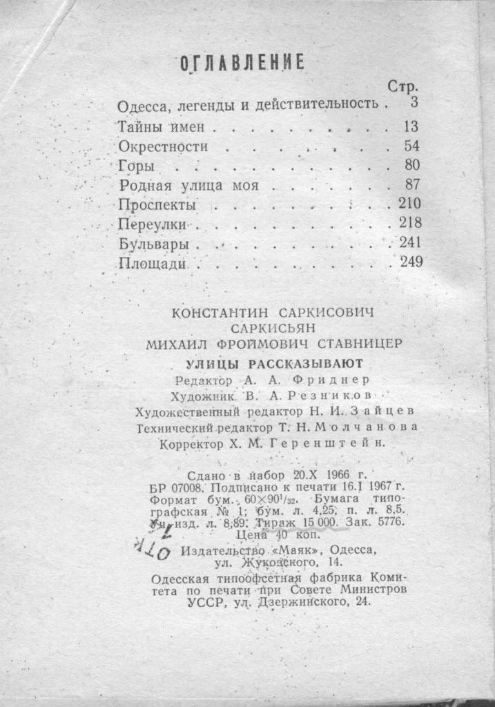 • Константин Саркисович Саркисьян, Михаил Фроймович Ставницер. Улицы рассказывают... – Изд. 4-е.– Одесса: Маяк, 1973.– 244 с. ил.