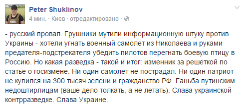 - русский провал. Грушники мутили информационную штуку против Украины - хотели угнать военный самолет из Николаева и руками предателя-подстрекателя убедить пилотов перегнать боевую птицу в Россию. Прикиньте, какая картинка для геббельс ТВ? Это уже минимум вторая попытка русских. Но какая разведка - такой и итог: изменник за решеткой по статье о госизмене. Ни один самолет не пострадал. Ни один патриот не купился на 300 тысяч зелени и гражданство РФ. Ганьба путинским недоштирлицам (ваше дело толкать, а не летать). Слава украинской контрразведке. Слава Украине.