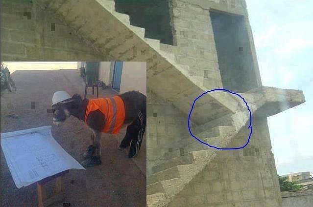 Там нет прикола! Там переиграли проект: сначала запланировали вход с первого этажа и смонтировали первый пролёт лестницы затем заложили дверной проём и этот пролёт стал не нужен