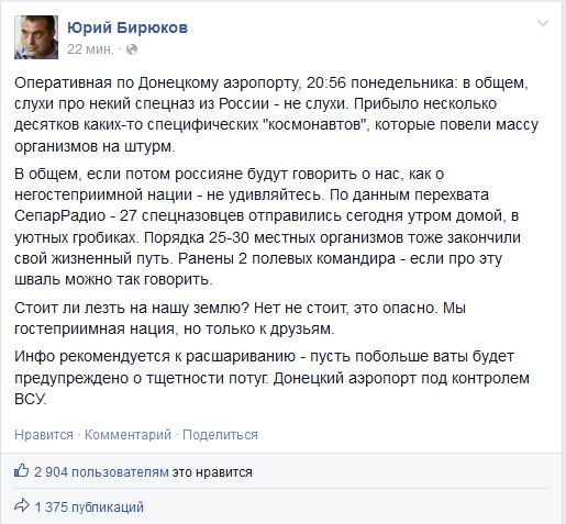 Оперативная по Донецкому аэропорту, 20:56 понедельника: в общем, слухи про некий спецназ из России - не слухи. Прибыло несколько десятков каких-то специфических "космонавтов", которые повели массу организмов на штурм.