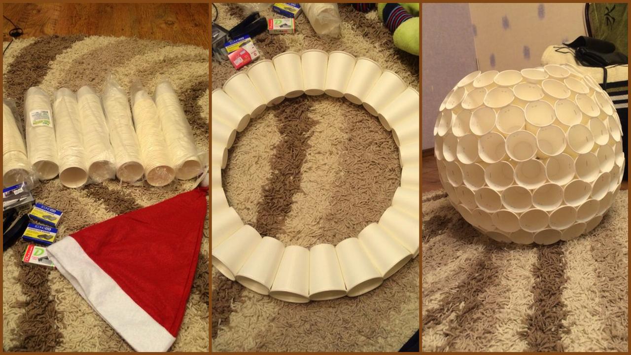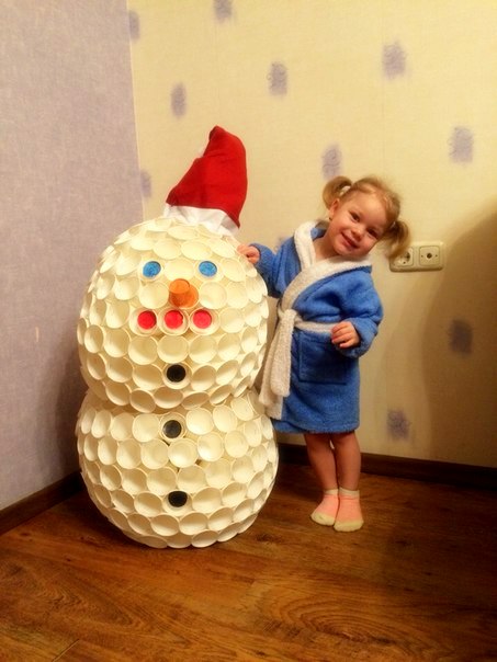 если вдруг кто то решит сделать такое, советую, стаканов у меня осталось штук 15 из 350, 300 точно было бы мало. и брать надо их 50 на 50, побольше размером и поменьше. а то голова меньше не получилась как я ни крутила те стаканы. и по времени сооружение 2 шаров заняло АЖ час...)