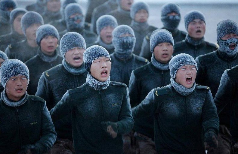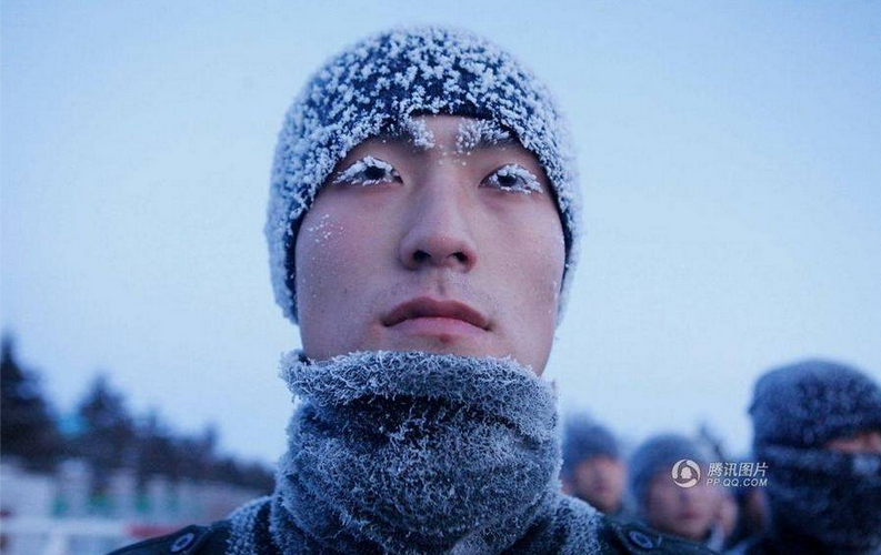 16 декабря 2014 года в г. Хэйхэ провинции Хэйлунцзян офицеры и солдаты пехотной роты пограничного полка Хэйлунцзянского военного округа проходят физическую подготовку на воздухе при температуре -30℃ для укрепления здоровья и воли.