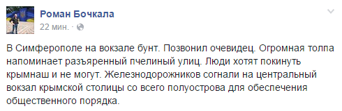 Что-то с Крымом я не поняла. Только что говорила с одним из бывших мужей, он собирался ехать к подруге в Евпаторию. На автобусе. Пошел на вокзал - говорят, все отменили, сдавайте билеты. Сдал. Позвонил подруге, она обиделась - говорит, у нас ничего не отменили, ты, наверное, не хочешь ехать. В общем, обиделась.