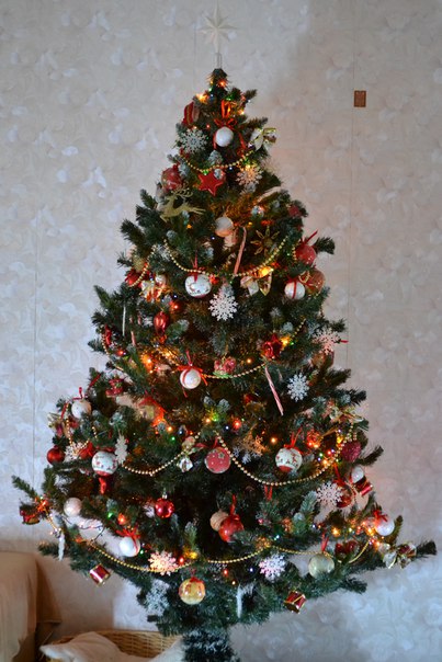А наша елочка в классике (из года в год она у нас одинаковая практически, обрастает только ежегодно несколькими новыми игрушечками)))