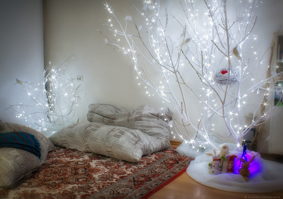 В этом году у нас получился ЭКО-вариант, как я давно мечтала. Ни одно дерево не пострадало - мы нашли уже срезанные после очистки парка деревья. Покрасили их красочкой и украсили декором, гирляндами. Еще были развешанные на веточках валяные игрушки собственного изготовления, но они уже подарились друзьям на вечеринке![]()