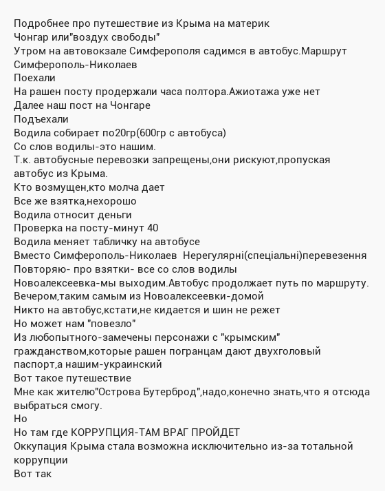 Коли по телевізору показують біженців з Криму, це, як правило, красиві, активні, талановиті люди, дуже мобільні та винахідливі. Вони пишуть картини, відкривають власні магазини, організовують туристичний бізнес, тощо. Дивлячись на них, з сумом думається – а ХТО ж залишається там?! Здебільшого ті, що хотіли померти в Росії та їхні діти, які чекають московських зарплат та пільг. Цілеспрямовані діячі, талановита молодь здебільшого полишає Крим, на заміну їм їдуть «брати» з Донбасу, росіян до розрахунку я спеціально не беру, з ними все зрозуміло. Та не про них мова.