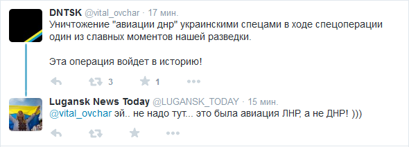 Утром в районе шахты № 7, Петровский район н.п. Донецк прогремело 3 взрыва. 2 взрыва в районе овощного рынка и 1 в районе бывшего горчичного цеха. Взрывы, как оказалось, произошли в результате попадания артиллерии ВС Украины в боекомплект. Примерно в это же время в том же районе находились и два известных боевика: Обезьяна и Мопед (читай Гывы и Мотороллер). Хотелось бы узнать, как их здоровье...