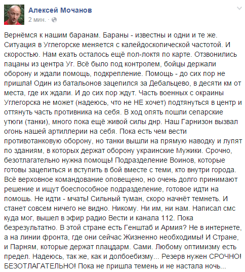 "приезжали орлы Захарченко, один из них сказал, что по городу бьют из ручного миномета чеченцы, у которых конфликт с Захарченко и они что- то от него требуют. "