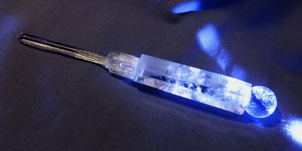 Он же при облучении длинноволновым ультрафиолетом. Ярко-пурпурная полоса по верху и пурпурноватый цвет самого камня - отражение UV-лампы, за флюоресценцию не считается..