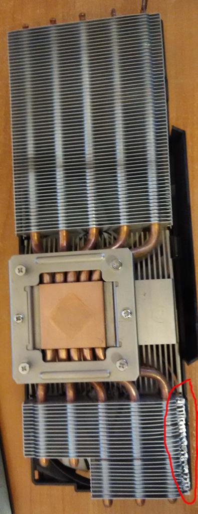 Продам охлаждение (cooler) для Radeon 5870, есть коробка, но нет всех радиаторов (а именно есть только 5 или 6 штук от памяти). Подрезаны ребра, хз зачем, отмечено красным кружком. Как говорится as is.
