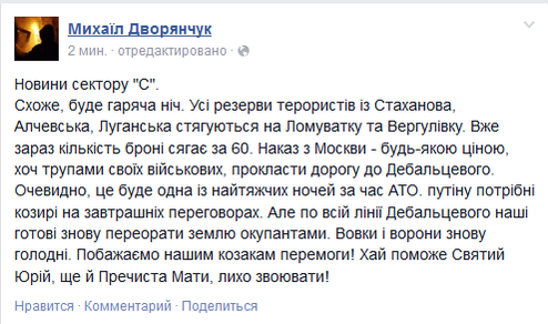 Деякий час тому відмінно спрацювала наша арта по скупченню російсько-терористичних БМ 21 і автомобілів з БК до них. По попередній інформаціі знищено 20 ворожих <Градів>, 30 машин з БК, близько 200 терористів. Вибух спричинив паніку в Донецьку. Слава украінськис воінам!