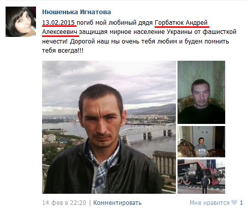 Еще один участник "грамшданскайвайнынаукраини" Горбатюк Андрей Алекс "Дизель" д.Тагара,Краснояр.кр,14/12/79 убит 13/02/15 у Дебальцево