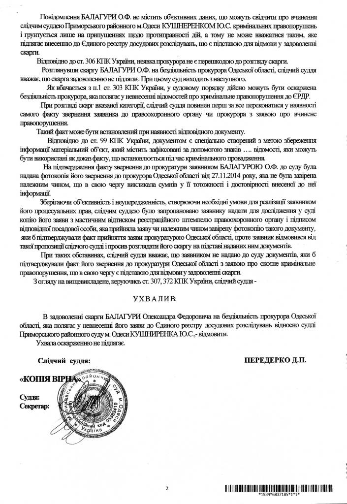Суть рассмотрения моей жалобы в Малиновском суде, была рассмотрение бездействия прокурора Одесской области Приз А.А. о не внесении моего заявления в ЕРДР и не начале досудебного расследования в отношении следственного (третий год подряд) судьи Приморского суда Одессы - Кушниренко.
