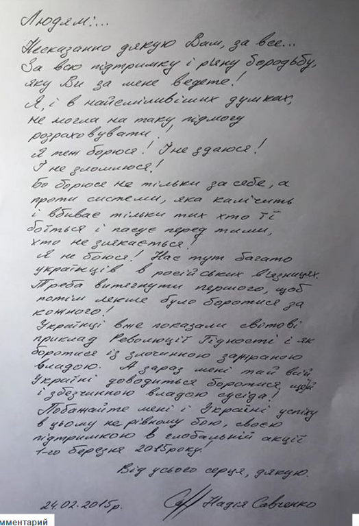 С просьбой освободить Надежду Савченко к российским властям обратился верховный комиссар ООН по правам человека Руперт Колвилл. Однако, в МИД России расценили это как попытку давления на российское правосудие. Сама Надежда Савченко, тем временем, обратилась из СИЗО со словами благодарности ко всем, кто ее поддерживает. Ее послание опубликовал адвокат Марк Фейгин: