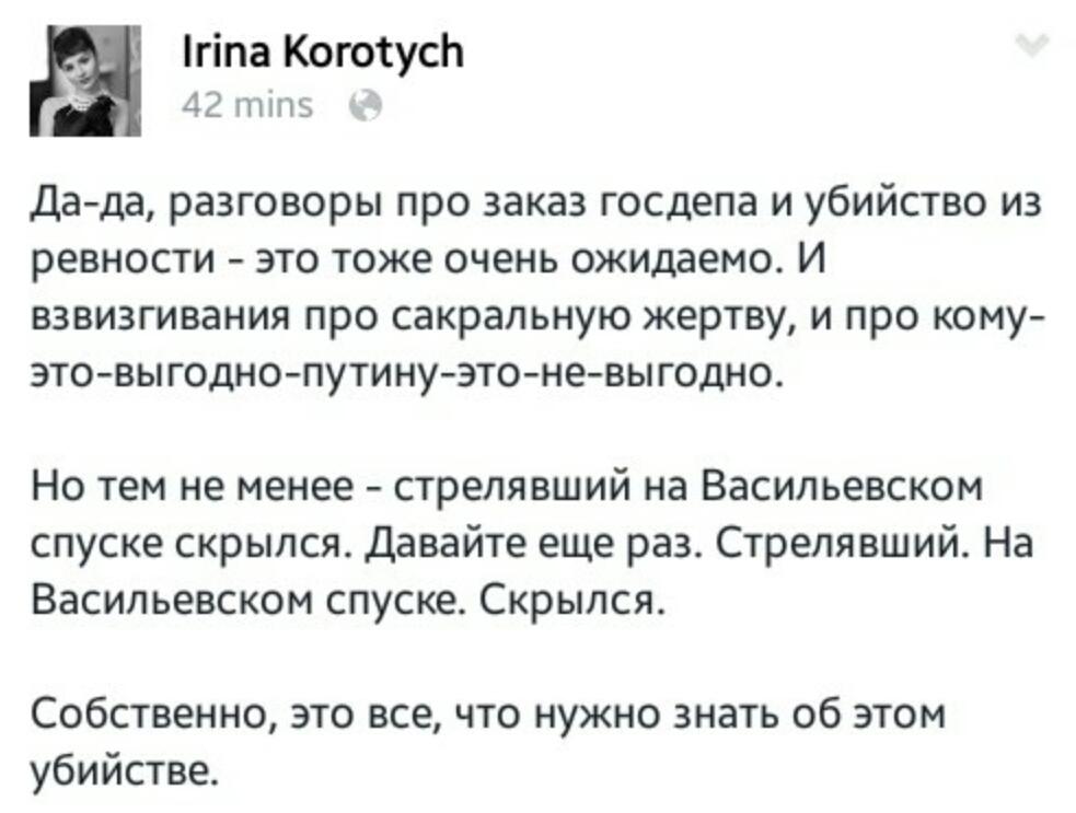 Но если Немцова в последние дни действительно вела везде наружка ФСБ, то в версию о фанатиках трудно поверить. Опять же возвращаемся к двум версиям - само пуйло организовало, либо его окружение с целью провокации против пуйла и отстранения его от власти. Не зря же недавно в США летали директор ФСБ и министр финансов рашки...