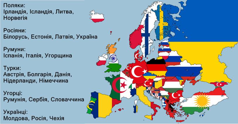 Мапа континенту в кольорах другої за чисельністю нації країни.
