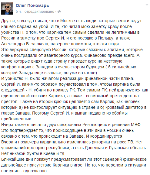 Похоже, что Захарченко и Плотницкий что-то знают! Сегодня они обратились к Олланду и Меркель с совместным заявлением по поводу минских соглашений. В Обращении ни слова о России, ни естественно о Путине, хотя логичнее было бы обращаться к главам РФ, Германии и Франции. И по моему мнению в подобном обращении Путин должен был бы быть на первом месте.