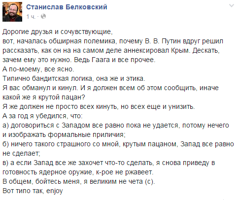 Не хотелось бы строить предположений, но взаимосвязь на лицо. Не успели в эфире канал "Россия 1″ показать документальный фильм об аннексии Крыма Россией под ура-патриотическим названием «Крым. Путь на родину», в котором Путин фактически признался в подготовке силового захвата полуострова у независимой державы, как стали появляться сообщения о том, что ряд высокопоставленных россиян уже находятся за пределами страны. Кадыров, предусмотрительно покинул Россию вылетев в Иорданию, Песков с семьей решил отдохнуть во Франции, а Сурков рванул в Гонконг.