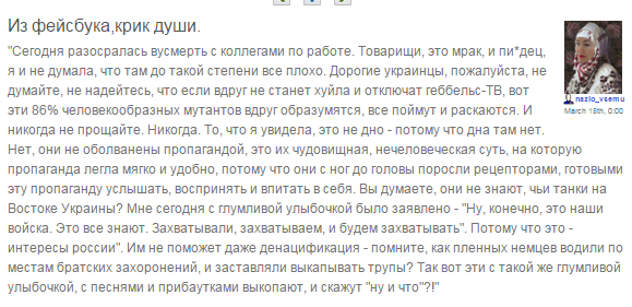 Боюсь, что они как раз и хотят, чтобы по городу ездили бухие боевики, чтобы давили и таранили все что движется, чтобы в магазинах вместо оплаты предъявляли автомат, чтобы вешали лапшу на уши, чтобы с полок пропали все продукты, зато появились очереди за гуманитаркой ахметова, чтобы цены на все взлетели в разы, чтобы транспорт ходил только до 19.00, а время было дебильное московское, чтобы пенсы толпами гоняли в соседний Краматорск для оформления статуса переселенца и пенсии. Еще дикий тренд у нас появился - быть девушкой попочленца, это все, о чем мечтают здешние малолетки. Девушка попочленца считается самой красивой, даже если выглядит как крокодил, девушка попочленца всегда обсыпана подарками, так как только у попочленцев есть деньги, девушка попочленца всегда лучше, чем девушка шахтера или металлурга, или еще какого-нибудь роботяги. Почему-то только среди студентов я не замечал особой тяги стать девушкой попочленца. Наверное недостаточно Константиновка вкусила русского мира, даже в Волновахе настроения кардинально отличаются.