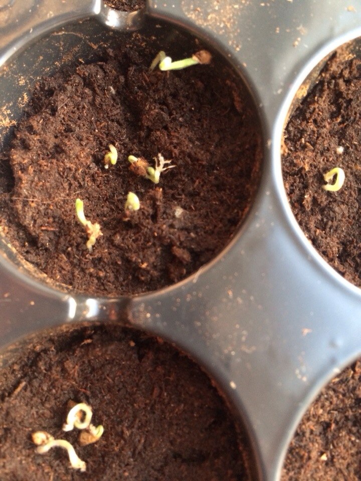 листочком у них не видать ,просто какие-то корешки мохнатые) и на коце у некоторых семечка видна ,которую я сажала)).. может их надо было глубже сажать?... я на пару мм закапывала.. и надо сейчас их присыпать землей немного?..